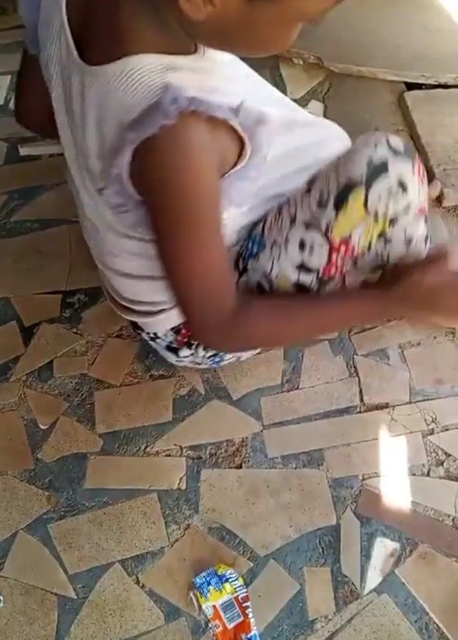 A young girl is sitting on a tiled floor outdoors. The tiles are arranged in a fractured pattern. She is wearing a white top and leggings with cartoon characters on them. An empty juice box wrapper is nearby. The girl moves her hands near the wrapper.