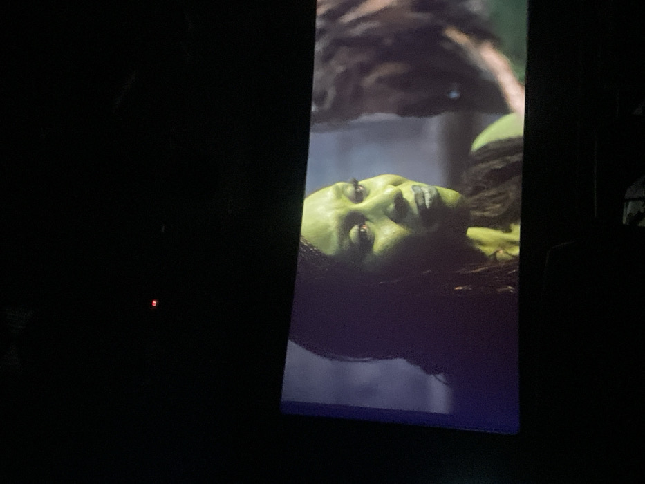 A screen dominates the view in near darkness. On the screen, a scene displays a prone figure with green skin and dark hair. The individual's face is tilted upwards, revealing closed eyes and a solemn expression. Above them, a blurred, darker shape hovers, possibly indicating an overhanging structure or foliage. The overall tone suggests a dramatic or somber moment within the displayed media. A small red light is visible in the dark space to the left.
