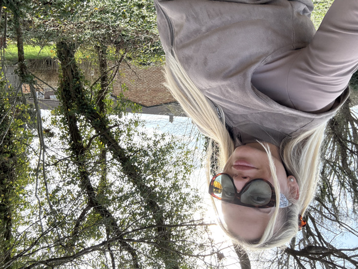 An outdoor, eye-level shot captures a blonde female in the foreground, appearing to take a photograph. She wears large, dark-lensed sunglasses with a tortoiseshell frame, a light brown long-sleeved top, and a sleeveless, quilted, suede-like vest of a similar taupe color. Her long blonde hair is styled down, with a tortoiseshell claw clip visible on the right side of her head. A small stud earring is present in her left earlobe. She faces the camera with a neutral expression. The background features dense vegetation, including several trees with varying degrees of leaf cover; some branches are bare, while others are covered in green foliage and ivy. Bright sunlight originates from the upper right, casting a glare. Behind the trees, residential brick houses with reddish-brown tiled roofs are visible. The ground is covered with green grass and dense ground cover. The scene is located in Crawley, United Kingdom.