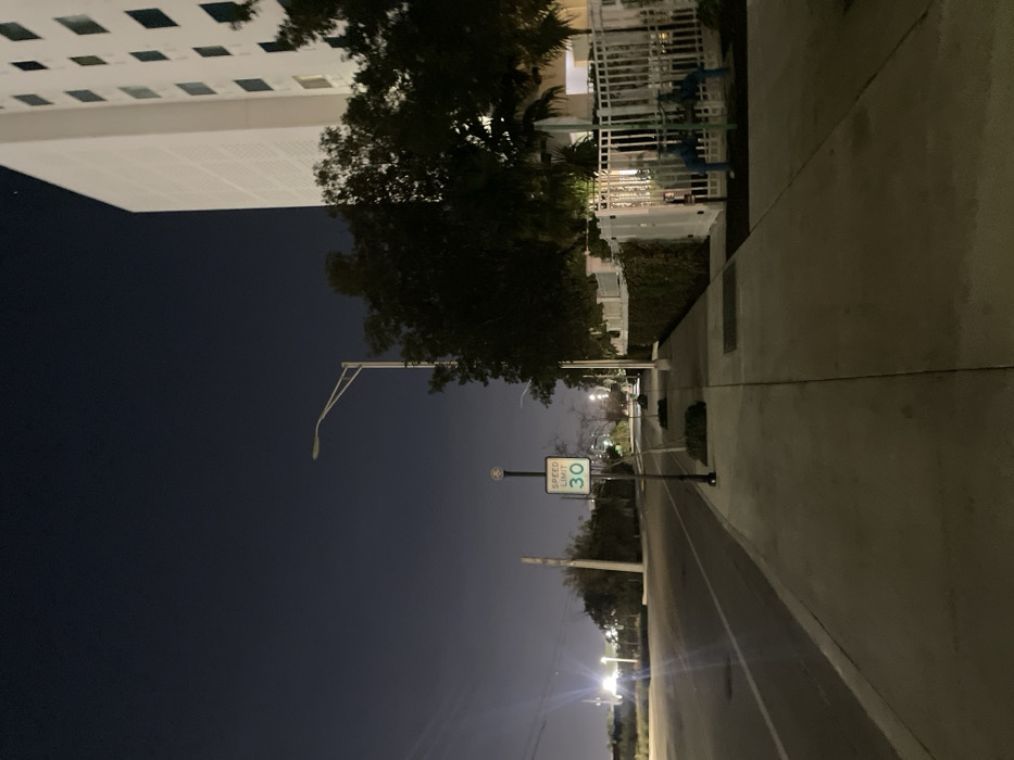 Night scene of a street with a "Speed Limit 30" sign. Street lights illuminate the road, sidewalks, and a building on the left. Trees are visible along the sidewalk and between the building and street. The sky transitions from dark above to lighter closer to the horizon, where distant lights can be seen. A fence and building structure are on the right.