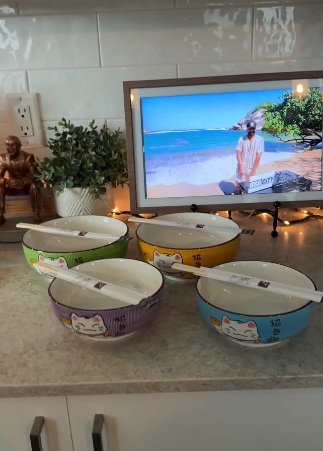 four colorful ramen bowls, each with a cat design and a pair of chopsticks resting on top. The bowls are arranged on a countertop in front of a television displaying a scene of a beach and a man. Behind the bowls is a small potted plant, a decorative figure, and string lights. The kitchen has white tiles and modern cabinets. Music plays in the background.