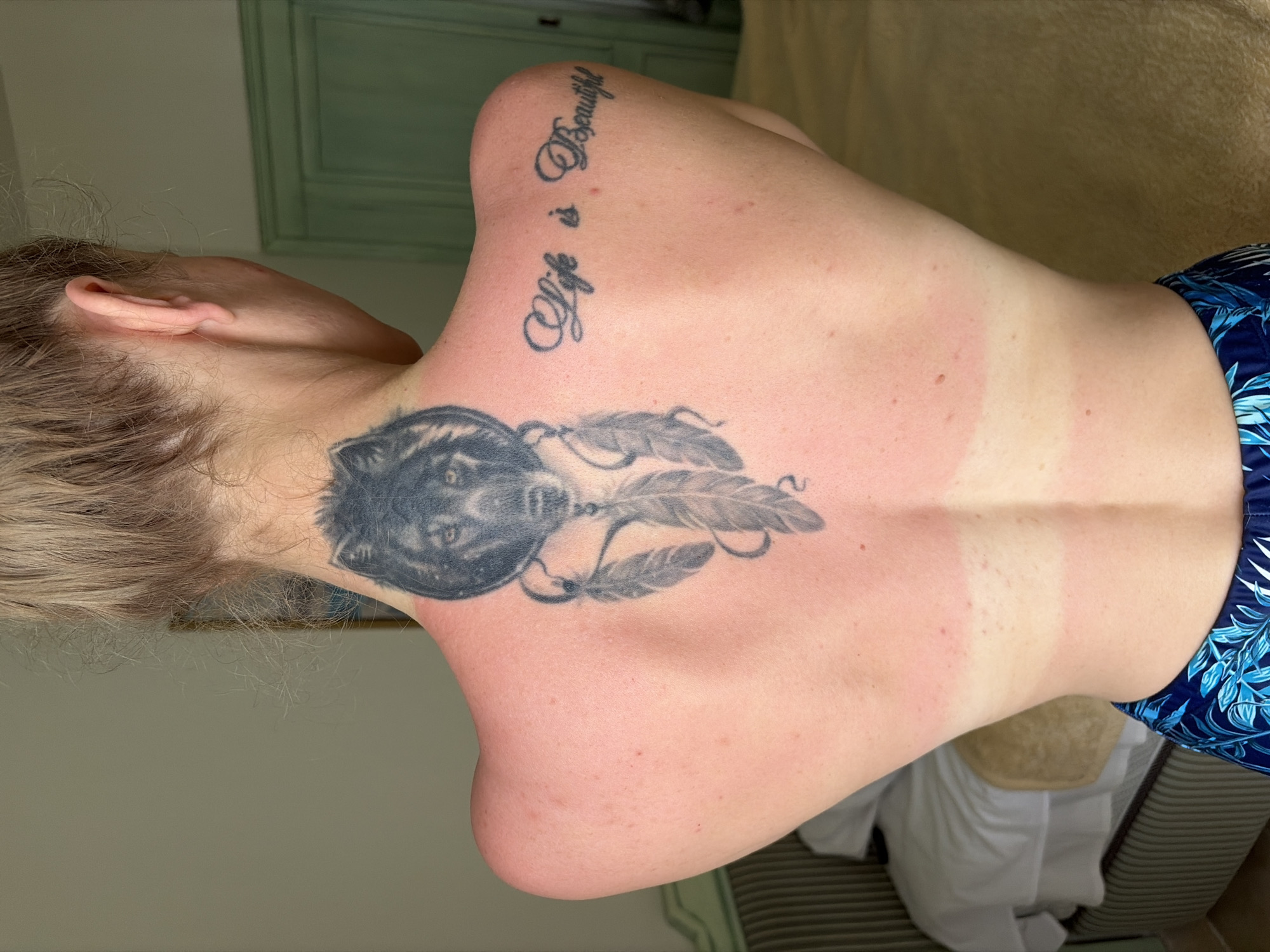 back and shoulder of a fair-skinned person. The skin is reddened with a clear tan line across the back. There are two tattoos: one on the left shoulder that reads "Life is Beautiful" in cursive, and another on the upper back depicting a wolf surrounded by feathers. The person is wearing blue swimming trunks with a tropical floral pattern. The background includes a green cabinet, tan-colored bedding, and striped seating. Based on the file metadata, the location is Sharm El Sheikh, Egypt.
