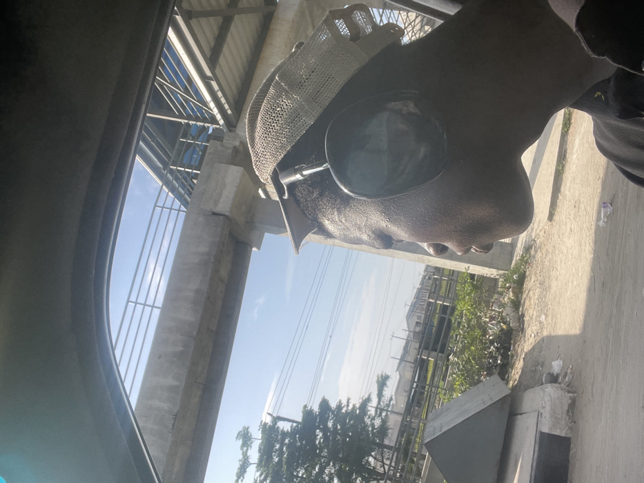 A person wearing a hat and sunglasses is seen in a low-angle shot from inside a vehicle. Outside the car window, there's a concrete overpass with metal railings. The sky is partially visible, and there are buildings and vegetation in the background. The environment suggests an urban or suburban area.