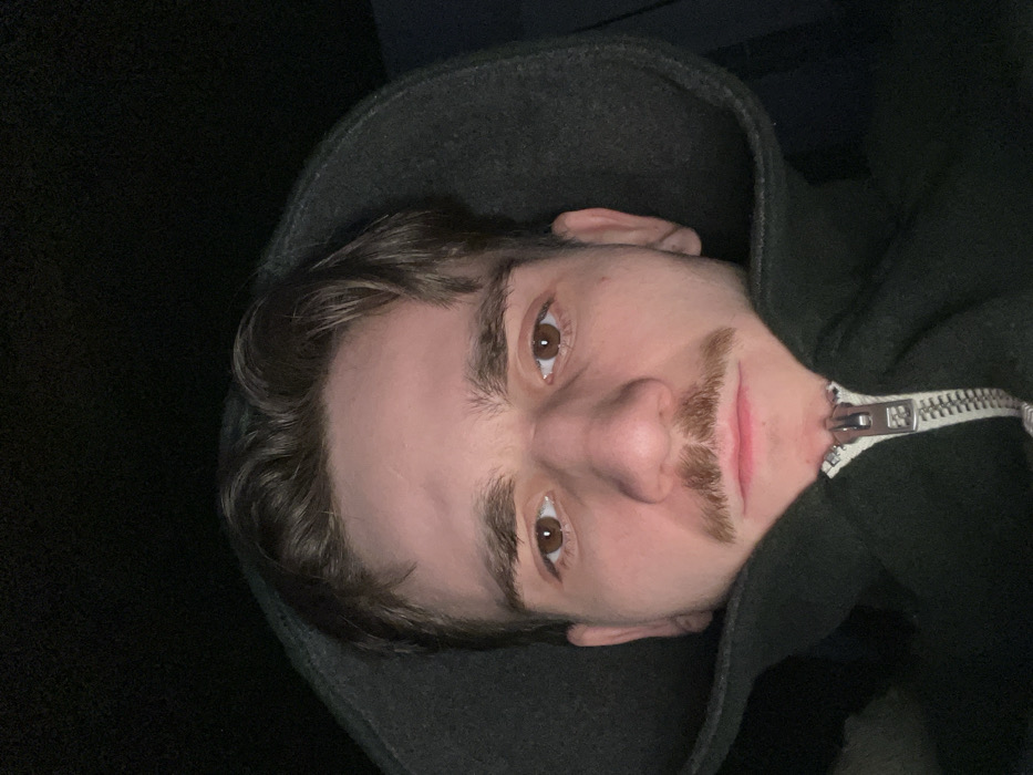 A man in a dark hooded jacket looks directly at the camera. He has brown eyes, dark hair with a visible part, and a trimmed mustache. The hoodie's zipper is partially visible. The background is dark, creating a low-light setting. His face is well-lit, emphasizing his features and expression.