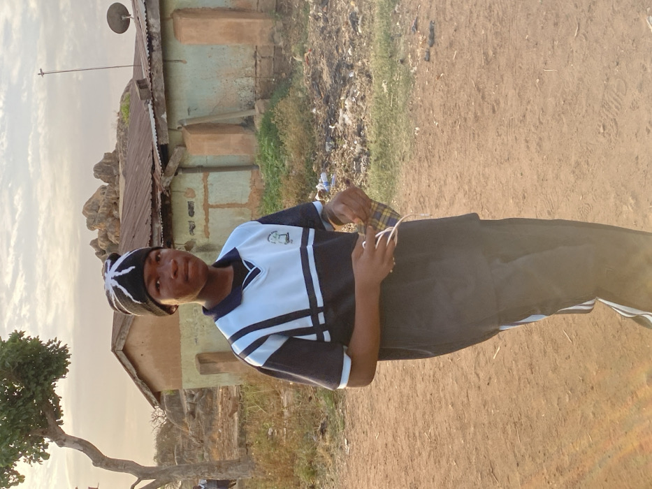 A young man wearing a striped beanie and a striped t-shirt stands outdoors. He is facing forward, holding a patterned item and a white cord in his hands. Behind him is a building with a satellite dish, and rocky terrain and foliage are visible in the background. The ground is dirt, and a small tree stands to the left. The image has a warm, sunny tone.