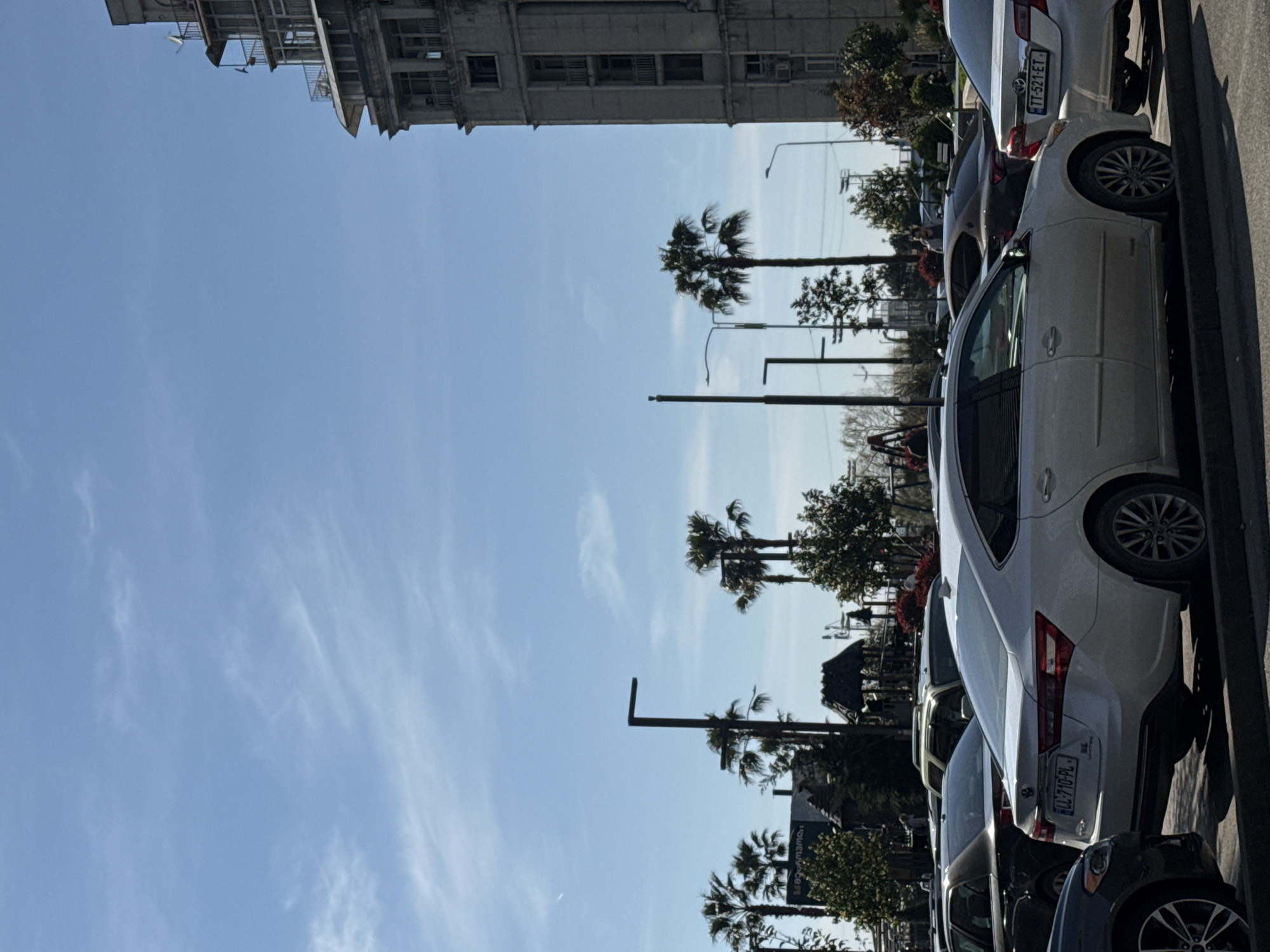 A daytime shot, taken in Unknown, Unknown, shows a row of parked cars along a street lined with palm trees and buildings. The sky is a clear blue with wispy clouds. Street lights are visible among the palm trees. The parked cars are various colors, including white, gray, and black. The buildings in the background are made of light-colored stone or concrete.