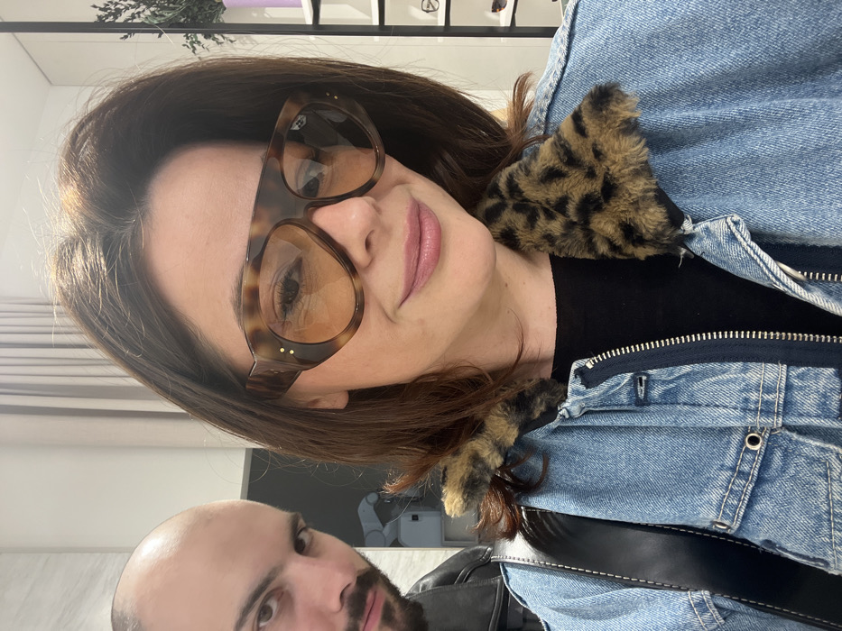 The image depicts two individuals inside a well-lit retail establishment in Lille, France. A woman, centrally positioned and occupying the majority of the foreground, faces the viewer directly. She has medium-length brown hair, light skin, and is wearing large, tortoiseshell-patterned aviator-style sunglasses with amber-tinted lenses and gold stud embellishments on the frames. Her lips are colored with pink lipstick. She is dressed in a light blue denim jacket featuring a brown and black leopard-print faux fur collar, layered over a black top. A black strap, consistent with a bag, is visible over her left shoulder. Her expression is a faint, closed-mouth smile. To her upper-left, a bald man with a dark beard is partially visible, also looking directly at the camera with a neutral expression. He is wearing a dark, possibly leather, jacket. The background reveals a modern interior, with white shelving units displaying various pairs of eyeglasses or sunglasses on the right side, and a light-colored wall with a partial view of an indistinct white fixture on the left.
