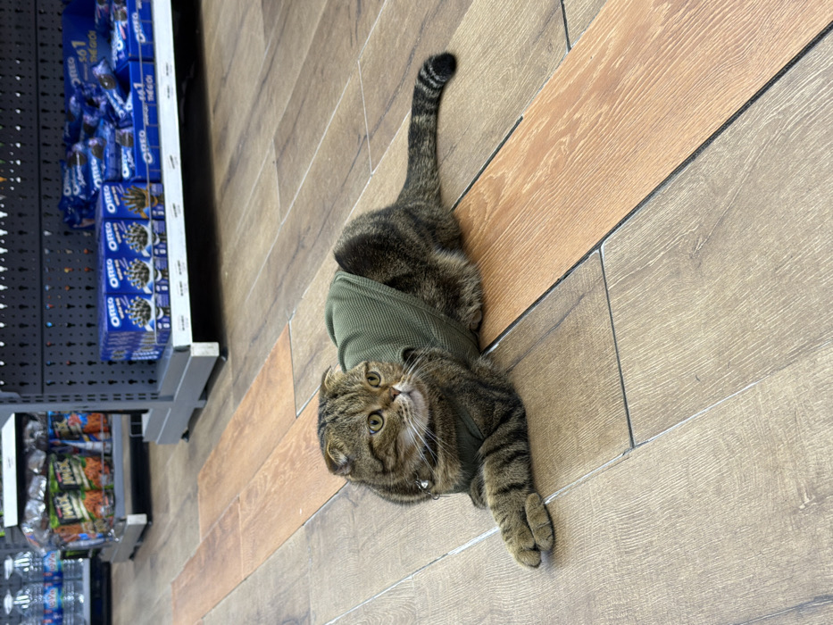 This image captures the interior of a commercial retail establishment, likely a supermarket or convenience store, situated in An Hải Ward, Vietnam. The central subject is a Scottish Fold cat, displaying brown and black tabby markings, lying prone on a light-colored, wood-patterned tile floor. The cat wears a ribbed, olive-green vest and a small, metallic bell is attached near its neck. Its front paws are crossed, and its gaze is directed towards the upper right quadrant of the frame. In the background, to the left, a silver-colored metal shelving unit is visible, stocked with clear plastic bottles of water and various packaged snack items, including bags labeled "JACK." To the right, a dark gray metal shelving unit displays multiple blue packages and boxes of "OREO" brand cookies, with Vietnamese text "5+1" and "TẶNG" visible on some of the packaging. The shelves are fully stocked. No human figures are present in the frame. The lighting is consistent with an indoor commercial setting.
