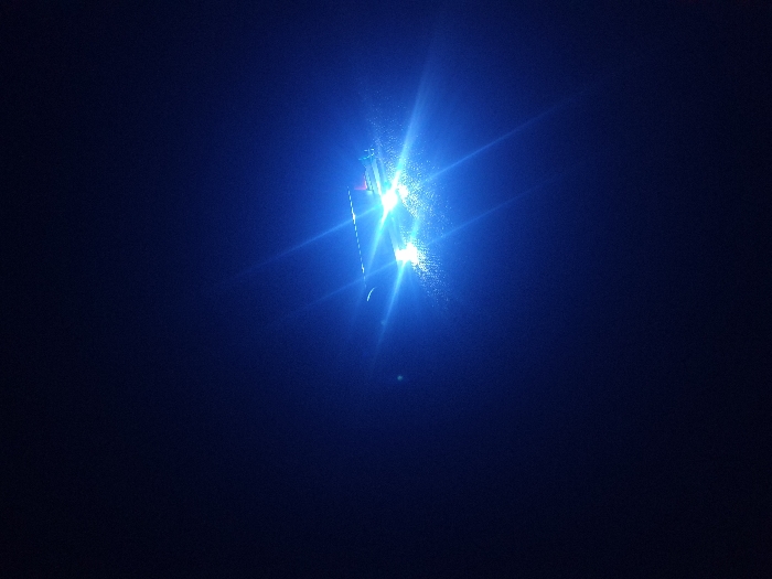 A central, concentrated bright blue light pierces the dark blue background, casting a distinct, linear reflection. The intense illumination emanates from an unseen source, creating multiple light beams that extend outwards. The overall effect is a stark contrast between the dominant light and the surrounding darkness, with some lens flare.