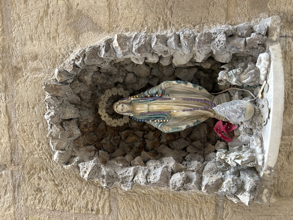 - "An outdoor religious shrine is set into a heavily textured, light beige limestone wall, characteristic of Valletta, Malta" by FM-1Neak1, licensed under CC BY 4.0