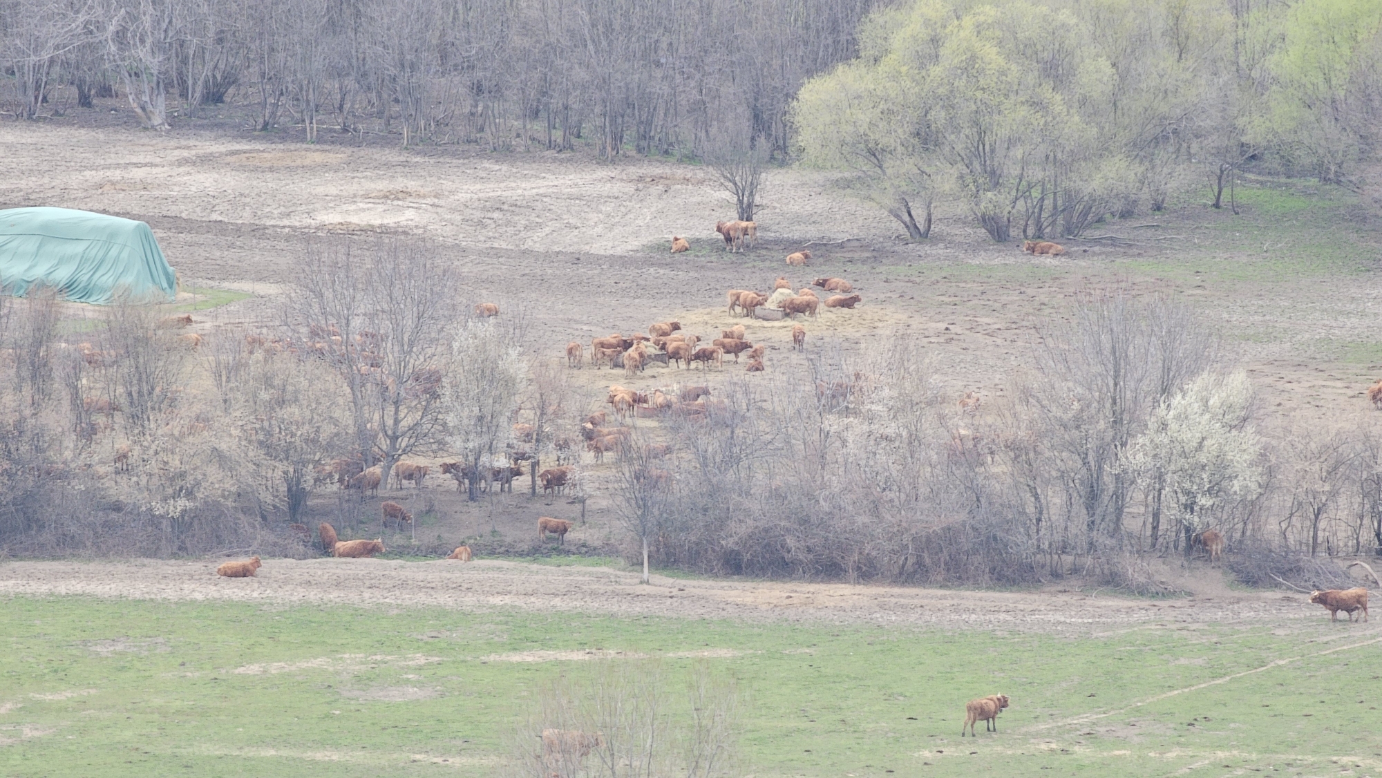 The image depicts an expansive rural landscape in Dabene, Bulgaria, under an overcast sky. The scene is dominated by a large herd of approximately 80-100 reddish-brown cattle, primarily seen standing, grazing, or resting across varied terrain. The foreground features patches of sparse green grass interspersed with areas of bare, muddy earth. A cluster of deciduous trees with white blossoms stands on the right, contrasting with other bare or lightly budding trees scattered throughout the middle ground. In the mid-ground, a significant portion of the cattle are congregated around a large, light-colored mound of hay, actively feeding. Other cattle are dispersed across the terrain, some lying down in the grass or mud, others standing individually or in small groups. To the far left, a large, teal-colored tarpaulin or tarp-covered structure is visible on slightly elevated ground. The background consists of a dense, leafless forest extending to the horizon, with some trees showing faint green foliage, suggesting early spring. The ground in the background appears largely bare earth. No human figures are present.