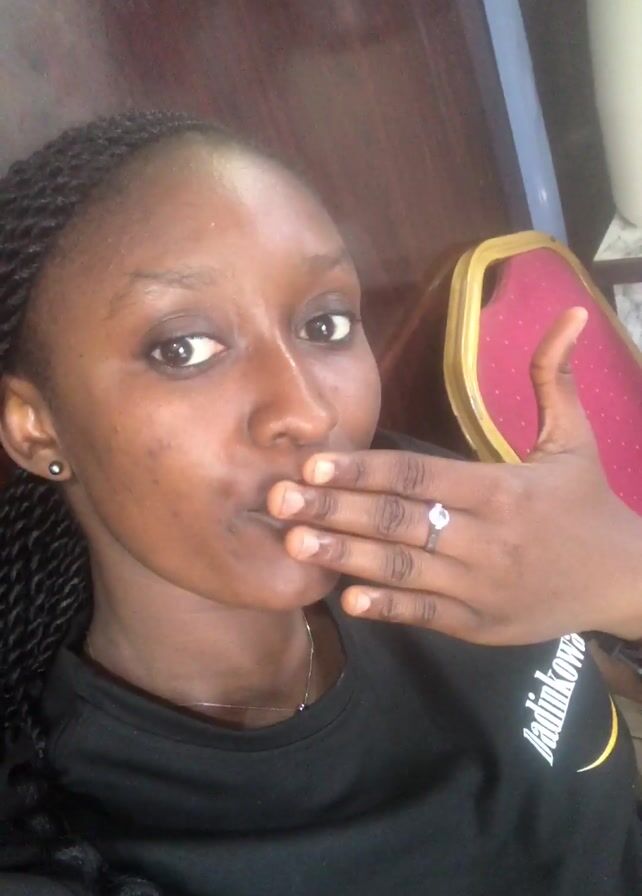 A woman is taking a selfie video. She is light-skinned and has dark hair in small braids. She is wearing a black t-shirt with white and yellow print. She makes a peace sign with her hand, then rests her hand on her chin. In the background is a burgundy padded chair with a gold frame, and a cabinet.