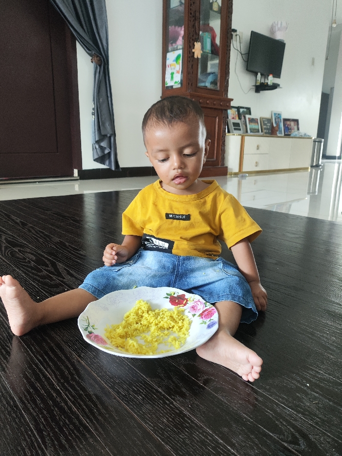 An image captured indoors in the city of Meunasahbaro, Indonesia, depicts a young child, likely a toddler, sitting barefoot on a dark brown wooden floor. The child wears a yellow long-sleeved shirt with a black patch on the chest and blue denim shorts, looking downwards with a slightly open mouth. A white plate with scalloped edges and floral patterns (red and pink roses) rests directly in front of the child, containing a pile of bright yellow rice. In the background, a dark brown door with a grey curtain is partially visible to the left. A tall, ornate dark brown wooden display cabinet with glass panels stands centrally. To its right, a low white cabinet with gold-colored trim supports multiple framed pictures, with a flat-screen television mounted on the white wall above it. A silver cylindrical object is visible against a white wall on the far right.
