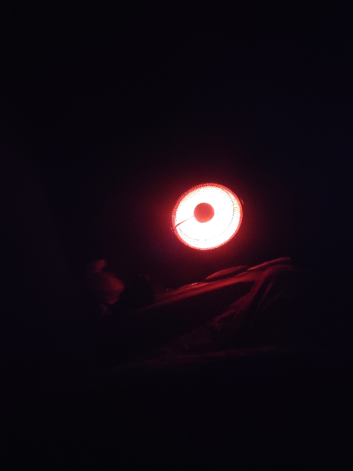 In near darkness, a circular, brightly lit red electric heater dominates the scene