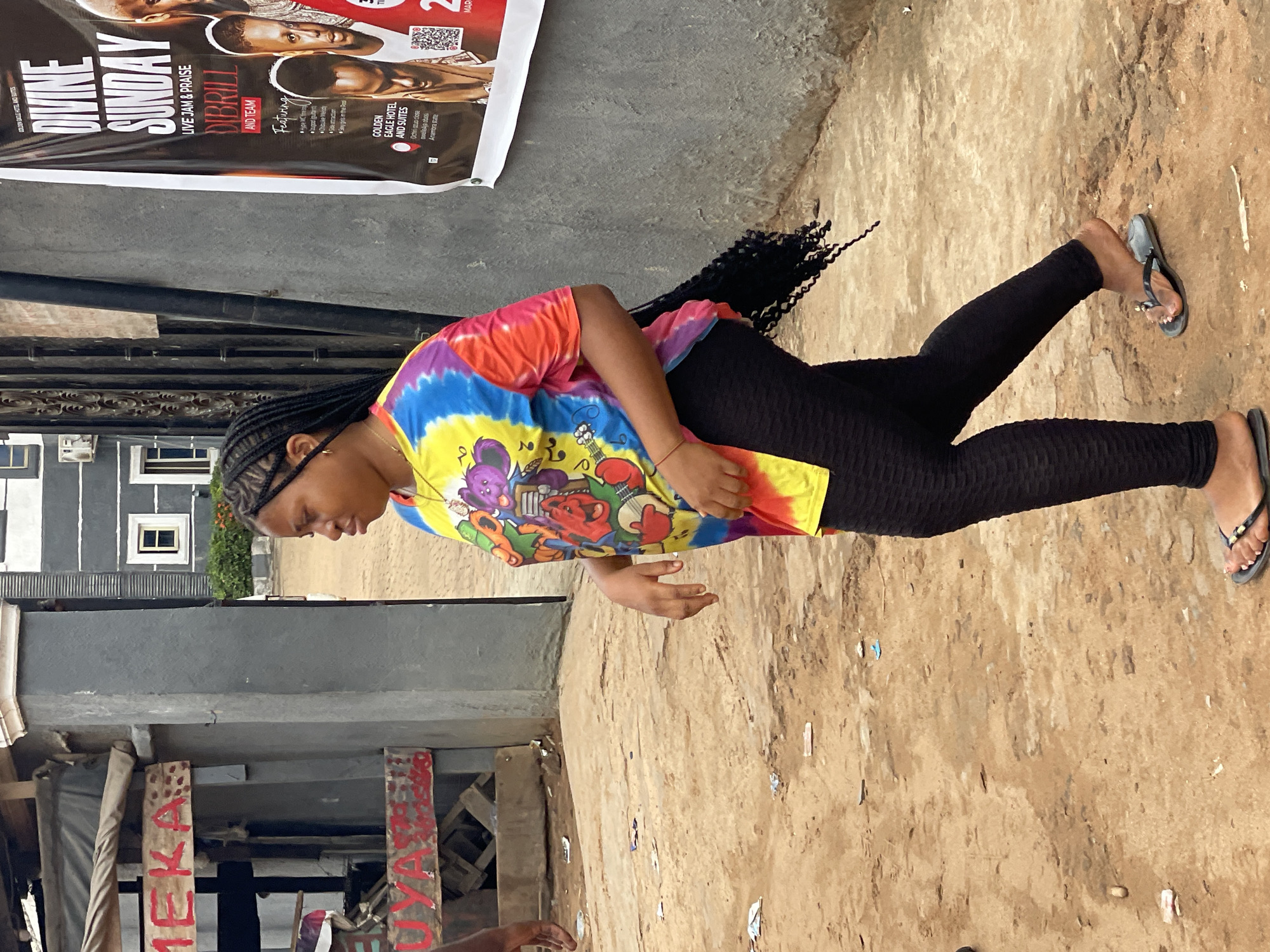 A young woman with dark braids is walking on a dirt and concrete path in Onitsha, Nigeria