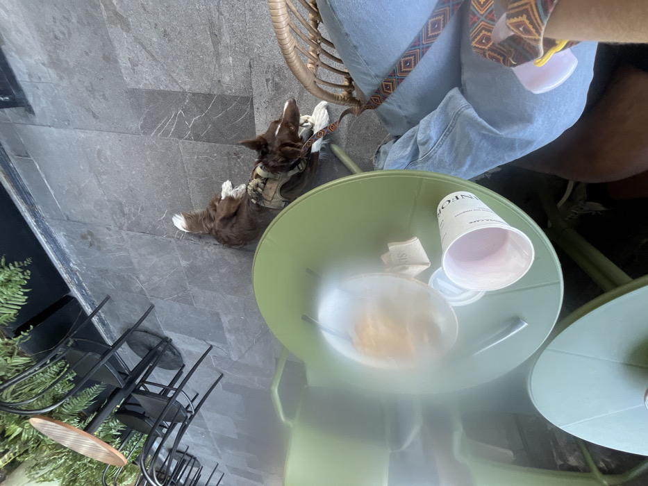 A brown and white dog wearing a harness lies on the gray tile ground next to a green table. On the table, a white coffee cup and a plate of food sit. Next to the table, a person in jeans sits in a wicker chair. Other tables and chairs are visible in the background. A fern is also visible.