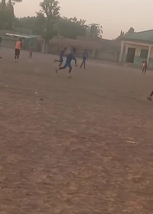soccer game on a dirt field. There are several players visible, some wearing blue jerseys and others wearing orange. The game appears to be taking place near a building that might be a school. The lighting suggests it is either early morning or late afternoon. The field is dusty. Players are running and kicking a ball.