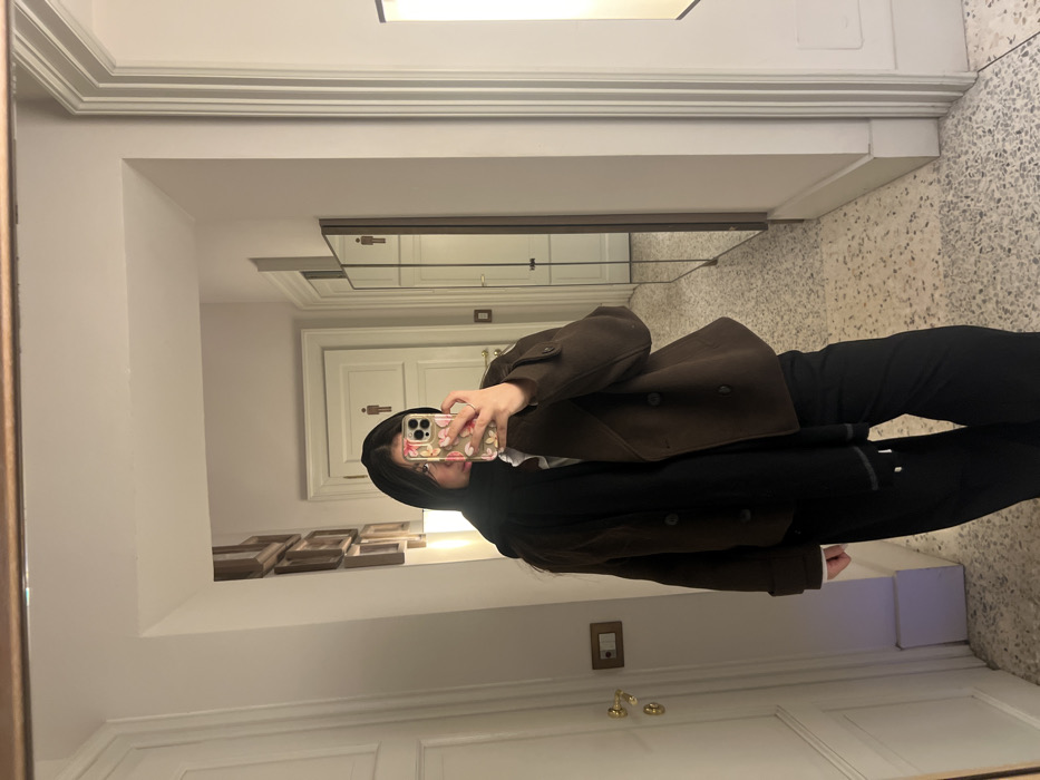 An individual is captured in a mirror selfie within an upscale interior hallway of a building in Milan, Italy. The person, facing the mirror, wears a dark brown double-breasted jacket over a white collared shirt, black wide-leg trousers, and a black head covering with a matching black scarf adorned with a light stripe and fringe. A smartphone, encased in a floral-patterned clear case, is held in the right hand, partially obscuring the individual's face. The reflection reveals a narrow, well-lit corridor with light-colored walls and a speckled terrazzo floor. To the immediate left of the reflected person, a white paneled door with a brass handle is visible, below a rectangular wall sconce and a brown electrical switch plate. Directly behind the reflected figure, a prominent white paneled door features a dark silhouette icon of a standing male, indicating a restroom or changing room. Further down the corridor, a decorative arrangement of multiple rectangular, dark-framed objects is mounted vertically on the left wall, while a tall, narrow structure composed of several mirrored panels stands on the right, also reflecting a male figure icon.