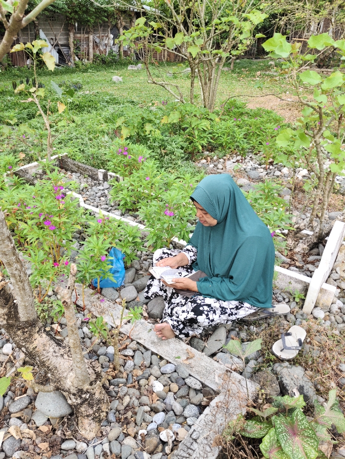 An elderly woman in a green hijab sits cross-legged on a stone-filled grave. She's engrossed in reading a book. Surrounding her are flowering plants, small trees, and various stones. A blue plastic bag sits among the plants. In the background is a yard with lush green vegetation. A pair of sandals rest near the edge of the grave.