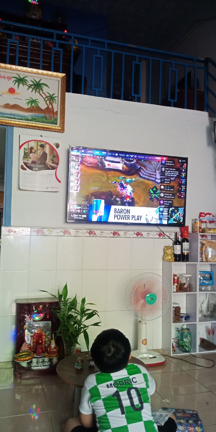 The image depicts a young boy sitting in a room, facing a flat-screen television displaying a video game. The room is located in Dĩ An, Vietnam (latitude: 10.902, longitude: 106.785). The television is showing a game of League of Legends with a red bull logo and a "Baron Power Play" banner at the bottom. The boy is wearing a green and white soccer jersey with the name "MODRIC" and the number "10" on the back. The boy is sitting on the floor in front of a coffee table, and there is a white ceiling fan to the right. The room has white tiled walls, a white ceiling, and an open space above a blue railing. To the left of the boy is a small altar with a lit candle, incense, and figurines. The room is decorated with framed artwork, including a picture of palm trees and a calendar. To the right of the television is a white shelving unit stocked with various items, including bottles of wine. The scene is captured from a slightly high angle, focusing on the boy and the television.