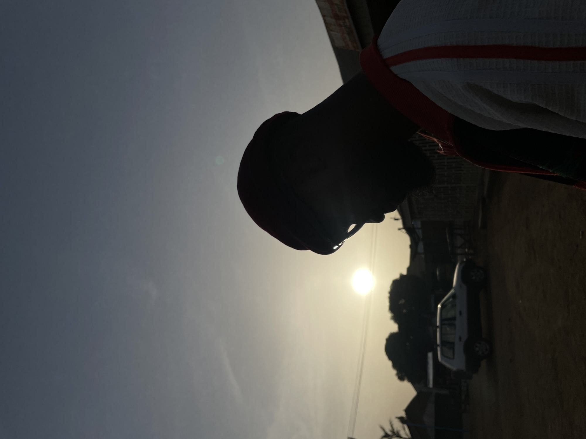 The scene is set outdoors in Barakin Akawo, Nigeria, under a low sun, likely during sunrise or sunset, creating strong silhouettes and backlighting. The sky transitions from bright near the sun to a muted blue-grey. In the right foreground, a male individual is depicted in silhouette, wearing a red beanie and glasses that catch ambient light. He faces left and slightly downwards. He is wearing a multi-layered garment, including a dark inner layer and an outer white or light-colored piece with prominent red vertical stripes or trim on the right side. In the midground, a light-colored SUV with roof rails is parked on an unpaved, dusty surface. Behind the vehicle, several large trees are visible, along with low-rise buildings that form a backdrop. Power lines traverse horizontally across the upper midground. The ground is unpaved earth. No direct interactions or distinct actions are discernible beyond the man standing.