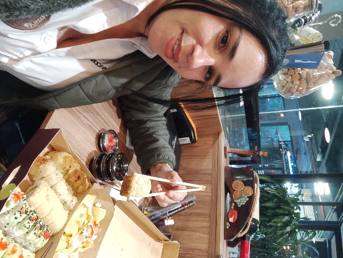 The image depicts an adult female seated at a wooden table inside what appears to be a casual dining establishment. She is positioned slightly to the left, facing the camera with a smile. She has dark hair and is wearing a white collared shirt under a dark green padded jacket. Her left hand, holding a pair of white chopsticks, grips a piece of fried or breaded sushi. On the wooden table to her right are two open cardboard takeout boxes containing various sushi rolls, including some with fried coatings, and a section with what appears to be chips or crisps topped with white and red elements. A small clear dish containing a red sauce and a stack of three small, dark, circular dishes are also on the table. Behind these items, pens and a black stapler are visible. A digital timestamp "24/02/2026 17:40" is overlaid in the lower right corner. The background features a wooden counter or shelf decorated with a wooden wine rack holding a red wine bottle, a wooden cross-shaped ornament, and a large glass container filled with wine corks. Wine bottles are also visible. A large glass partition separates the dining area from an outer space featuring green foliage and ambient lighting, indicating either an exterior view or another section of the interior. The image does not contain explicit identifiers for the city of Tumbaco, Ecuador.