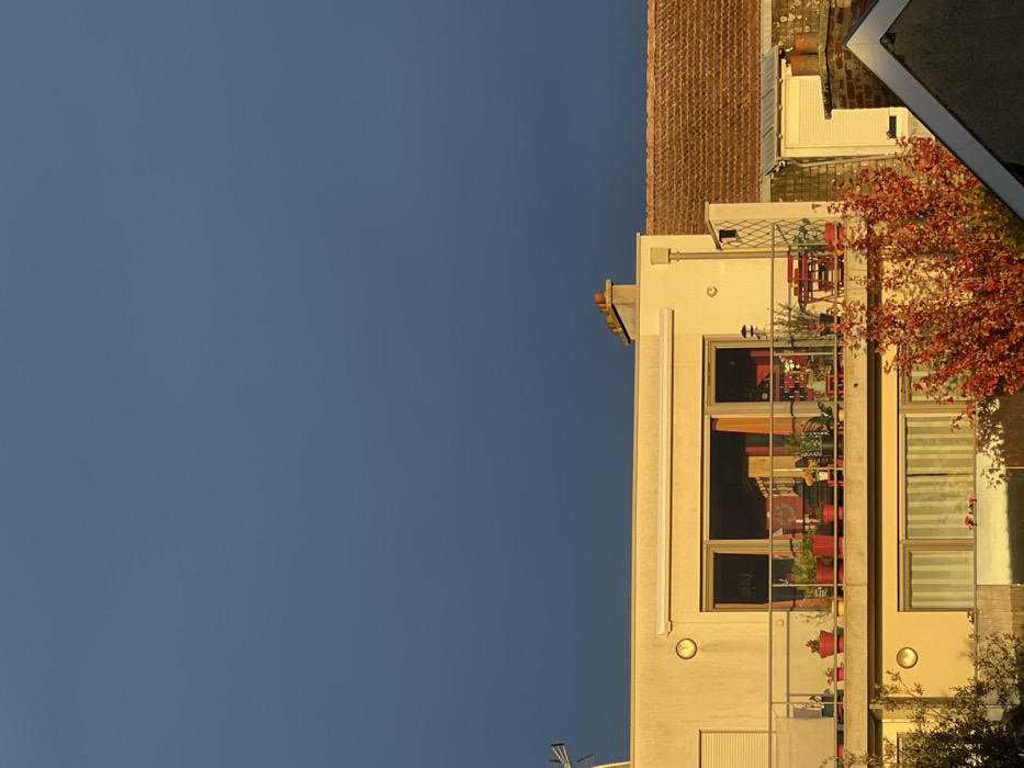 This image depicts a residential scene in Reims, France, under a clear, dark blue sky. The primary subject is a two-story, light-colored building, illuminated by warm, golden sunlight originating from the left, consistent with late afternoon or early morning light. The upper level of the building features a large balcony enclosed by a transparent glass railing. Numerous potted plants in terracotta, red, and yellow containers are arranged along the balcony. On the right side of the balcony, a small outdoor dining set consisting of a red table and two red chairs is positioned. A multi-panel glass door opens from the balcony into the interior, revealing a reddish-orange wall and various indistinct objects within. A circular light fixture is mounted on the building's facade to the left of the balcony. A television antenna or satellite dish structure is visible on the far-left roofline, and a brick chimney is present on the right-hand section of the roof. The lower level of the building has windows, partially obscured by an autumnal tree. Adjacent to the main building on the right, a structure with a reddish-brown tiled roof is visible. Below this, a portion of another building with white roller shutters and exposed brickwork is present. In the lower foreground, a deciduous tree displays vibrant orange-red foliage, partially obscuring the view of the lower building sections. No individuals are visible within the frame.
