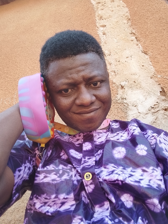 A male individual with dark skin and short, dark hair is captured in a front-facing, chest-up selfie. He wears a purple garment adorned with lighter purple, tie-dye style patterns and a prominent gold-colored button on the chest, detailed with a 'D' or similar emblem. A colorful, patterned lanyard is visible around his neck. He holds a multi-colored (pink, light blue, yellow) object resembling a toy phone or novelty case with cartoonish facial features to the left side of his head, covering his ear. The background consists of a textured wall in shades of reddish-brown and tan, featuring a vertical lighter-colored strip. The specific location within the city of Television, Nigeria cannot be determined from the visual information presented; the scene appears to be set outdoors or in a semi-enclosed area.