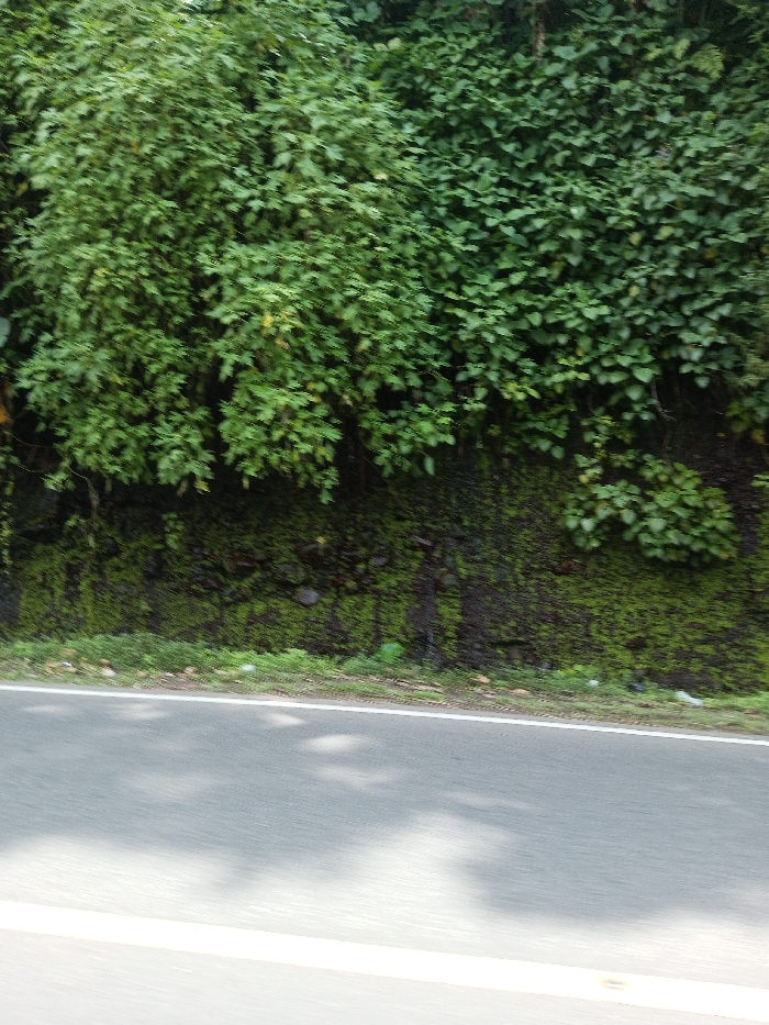 The image presents a roadside scene in Vieng Phouka, Laos, captured from a moving perspective. The upper two-thirds of the frame are dominated by a steep, densely vegetated embankment. This embankment features two main types of green foliage: lighter, small-leaved plants on the left, and darker, broad-leaved plants on the right, forming a continuous, lush canopy. Below the upper vegetation, a darker, possibly rocky or earthen wall is visible, heavily covered with vibrant green moss and interspersed with darker, wet-looking streaks or stains. Several dark, irregularly shaped stones are embedded within the moss-covered wall. Small, green ground cover plants grow along the immediate base of the embankment. The lower third of the image shows a light gray paved road, delineated by a prominent solid white line along the edge nearest the embankment. A fainter, less distinct white line is also visible further into the foreground. Multiple irregular, diffuse shadows are cast across the road surface. No individuals, vehicles, or specific actions are present in the scene.