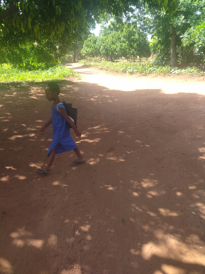 young girl walking on a dirt road in the outskirts of the city of Tuoniako, Nigeria, at coordinates (latitude: 7.462, longitude: 7.155). The girl is wearing a blue dress and is carrying a black backpack. She is walking on a dirt road that is surrounded by trees and bushes. The ground is covered in dappled sunlight. The girl is walking in the direction of the camera and is looking down at the ground. The trees cast long shadows on the ground. The scene appears to be in a rural area. The girl is walking away from a tree-lined pathway.