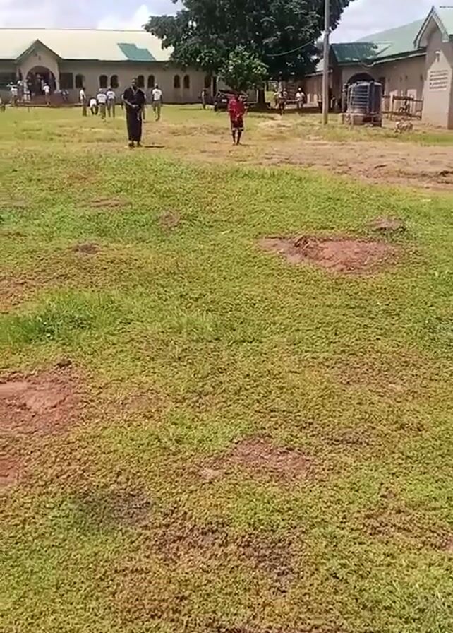 partially grassy and partly muddy field with a building in the background. There are several people visible in the distance, some walking and some standing near the building. A person in the foreground wearing a white t-shirt with "NYSC" printed on the back, green pants, a green cap, and brown shoes, is walking across the field. This person is also holding a phone in their hand and appears to be recording the video. The weather looks sunny with a cloudy sky.