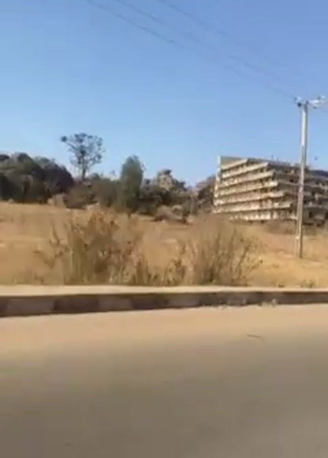 building with a unique terraced design, positioned on a small hill with dry grass. The building is unfinished. The camera moves along a road, showing telephone poles, sparse trees, and the building in the distance. The sky is clear and blue. No people are visible.