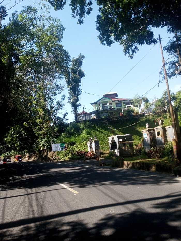 The image captures a daytime scene in Niz Lakuk, India, on a clear day with a bright blue sky. A two-lane asphalt road with a faded white center line occupies the foreground, traversed by several shadows from unseen overhead foliage. On the left side of the road, three vehicles are visible: a white car, a red auto-rickshaw, and a motorcycle with a rider, all moving in the same direction. To the right of the road, a green, grassy embankment slopes upwards. At the base of this embankment, a series of ornate, light-grey structures resembling gate pillars or decorative kiosks are arranged alongside landscaped sections containing reddish-brown foliage. A white rectangular sign is visible near the road on the left side of these structures. Perched atop the hill in the background is a multi-story building featuring light green exterior walls, a red-brown pitched roof, and multiple balconies with dark railings. Electrical utility lines are visible crossing the sky between the distant trees and the building. Dense green foliage and tall trees frame the left and top portions of the image.