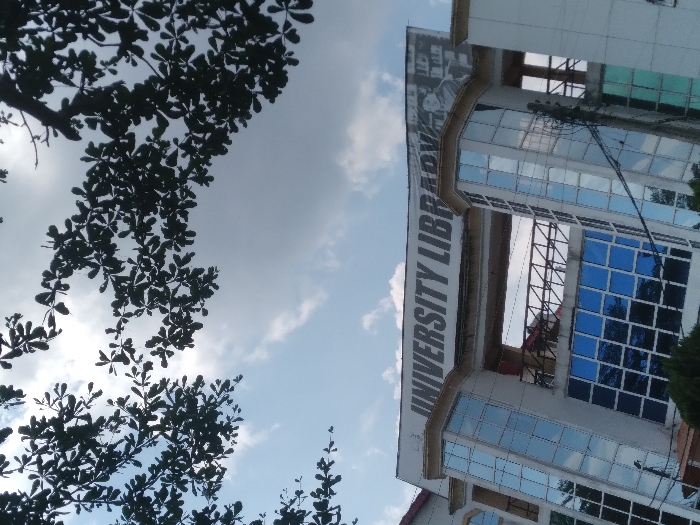 An upward-angled outdoor photograph depicts the upper section of a modern university library building located in Osu, Nigeria, under a partially cloudy sky