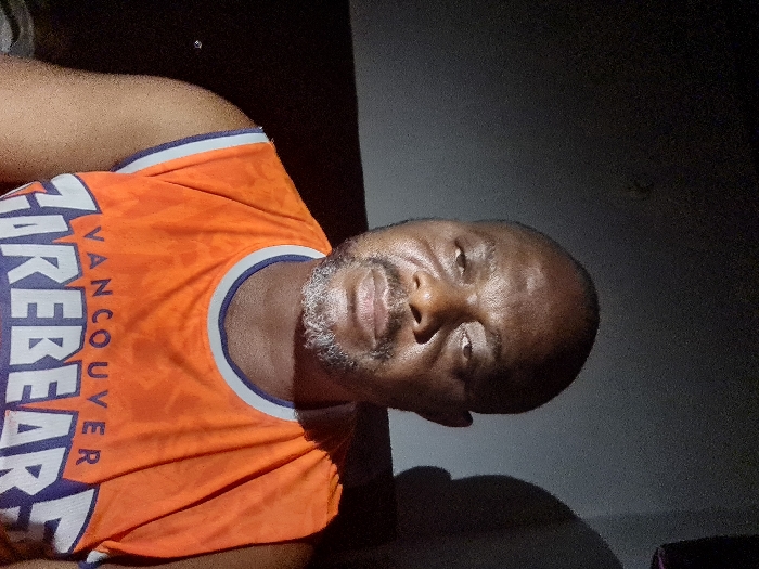 A close-up shot features a Black man in an orange tank top with "Vancouver Barebear" printed in purple letters. His face is turned slightly to the side with a faint smile. He has a dark complexion, a bald head, and a short, grayish beard. The lighting is dim, creating shadows on his face and the background. The image is rotated to the left.
