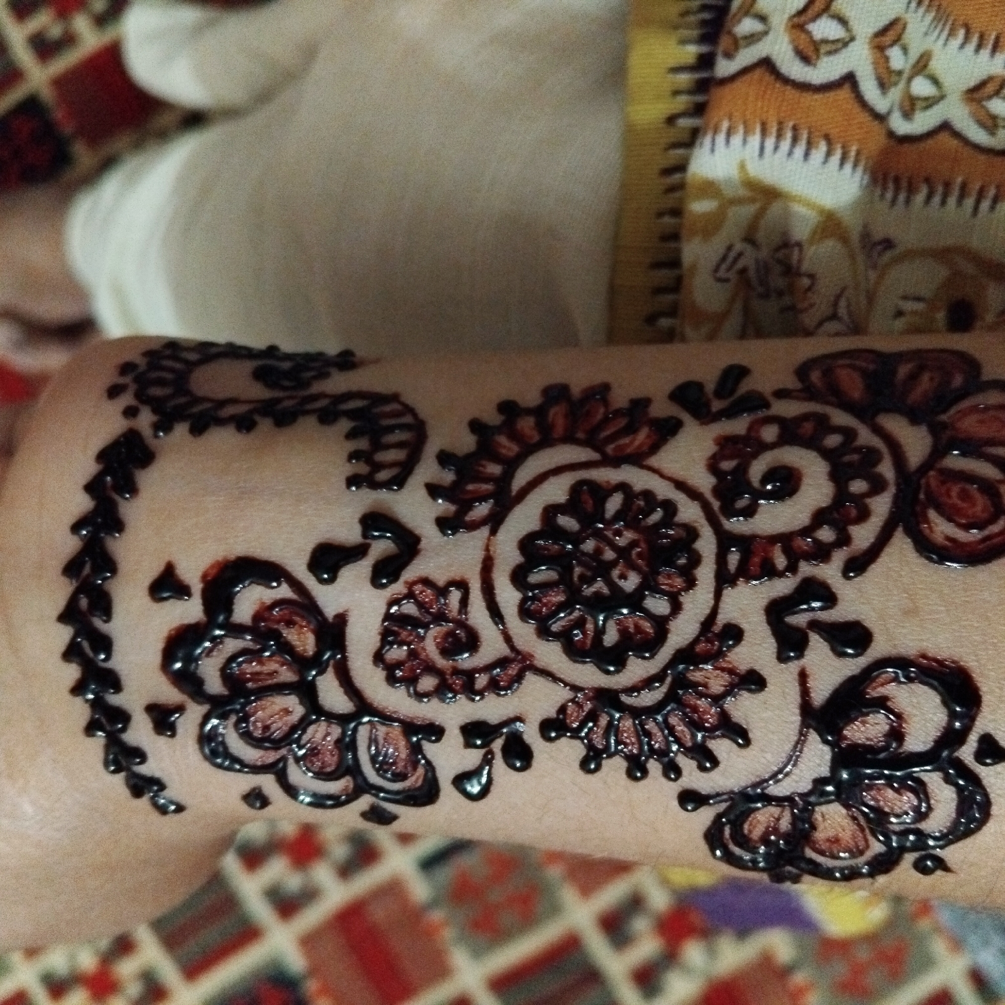 A human forearm is prominently displayed in the foreground, adorned with intricate, dark brown, glossy henna (mehndi) designs that are still wet, indicating recent application. The patterns consist of floral motifs, spiraling elements, teardrop shapes, and geometric borders. The skin tone is light to medium. In the blurred background to the left, a patterned textile, possibly a rug, features geometric shapes in red, brown, and off-white. To the right, blurred light-colored fabric, likely clothing, is visible, with a distinct yellow and orange patterned border at the bottom that exhibits a serrated edge and light-colored designs. The scene suggests an indoor domestic setting in the city of Unknown, Unknown. No individuals are fully depicted; the image focuses solely on the arm and its fresh henna application.