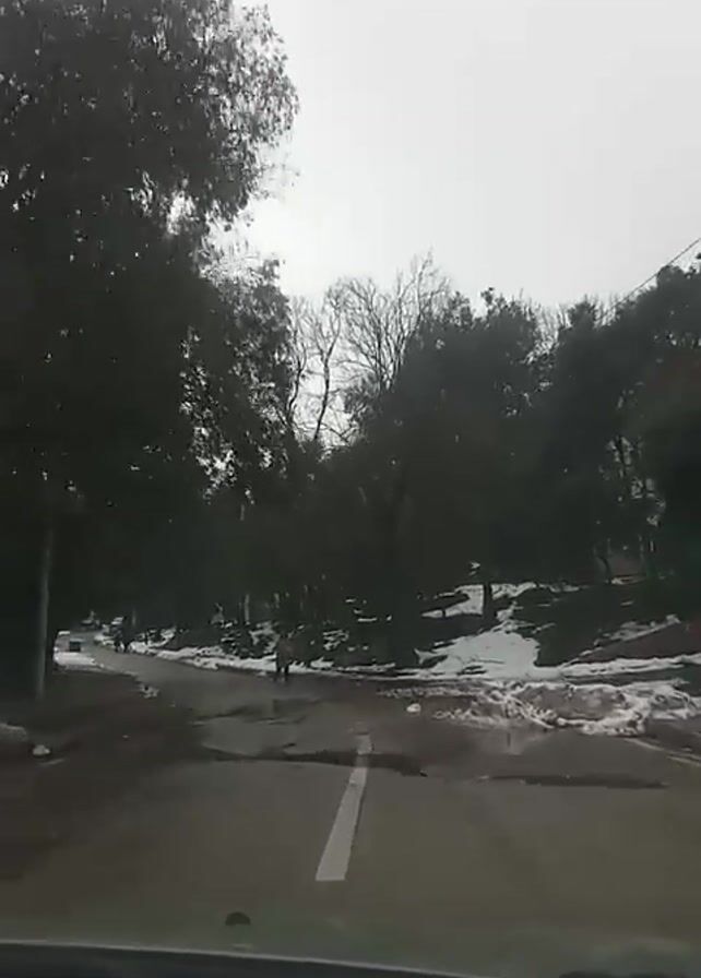 The view from inside a moving car shows a narrow road running through a wooded area in what appears to be winter. The road has a white line down the middle. Snow is visible on the sides of the road, but the road surface is wet and clear. There are trees on both sides of the road, and in the distance, a few figures appear to be walking. A street lamp is on the left side of the road. The sky is overcast and gray.