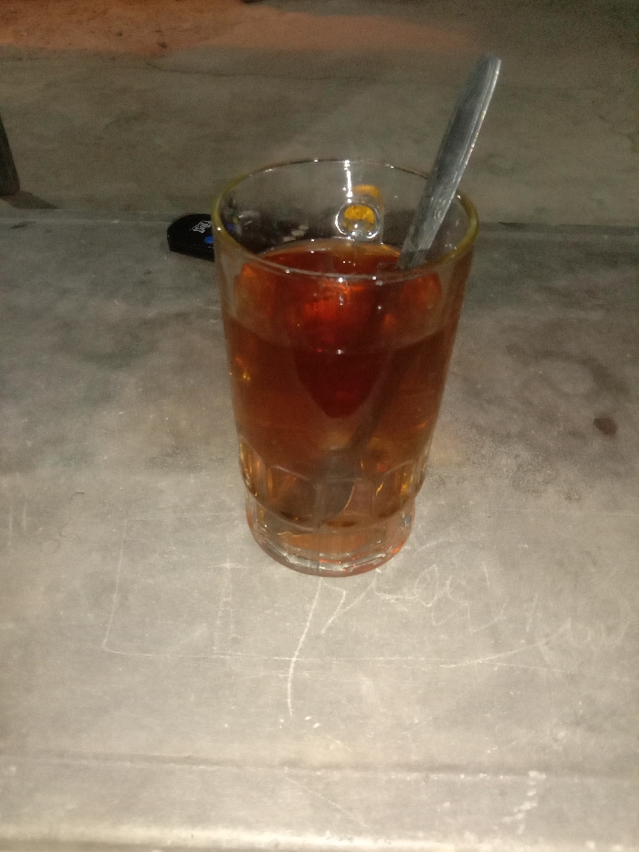 A glass of reddish-brown liquid, possibly iced tea or sweetened tea, stands on a mottled gray surface. A silver spoon is immersed in the liquid. A small, dark object sits to the left of the glass. The surface bears faint white markings that resemble doodles or writing. The lighting appears low, casting soft shadows.