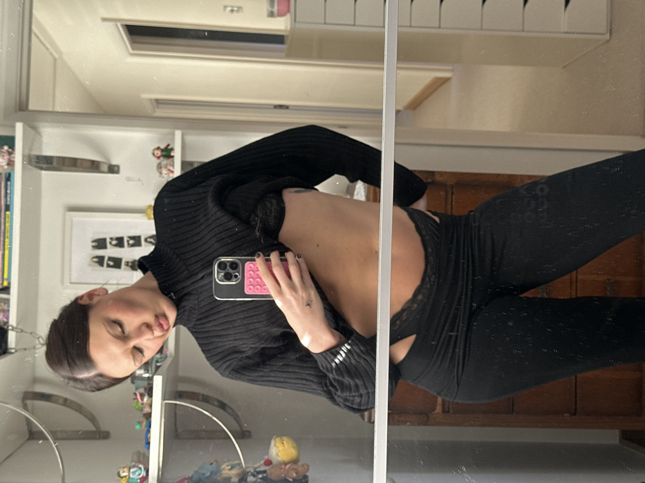 A female individual is depicted in an indoor, likely residential setting, described as being in Wealden, United Kingdom, taking a mirror selfie. The individual has dark hair pulled back and is making a puckering facial expression. She is wearing a black ribbed long-sleeved turtleneck sweater, which is pulled up to expose her midriff and the left side of her torso. Black lace-trimmed underwear is visible above black form-fitting trousers. Her left hand, featuring black nail polish and a small star tattoo on the wrist, holds an iPhone with a black case and a pink pop-socket, pointed towards the mirror. Patches consistent with vitiligo are visible on her left wrist and forearm. The reflected background includes white walls, white floating shelves displaying various decorative objects and a framed image featuring multiple figures, a wooden chest of drawers on the left, and a white chest of drawers on the right. A doorway leading to another room is visible to the right.
