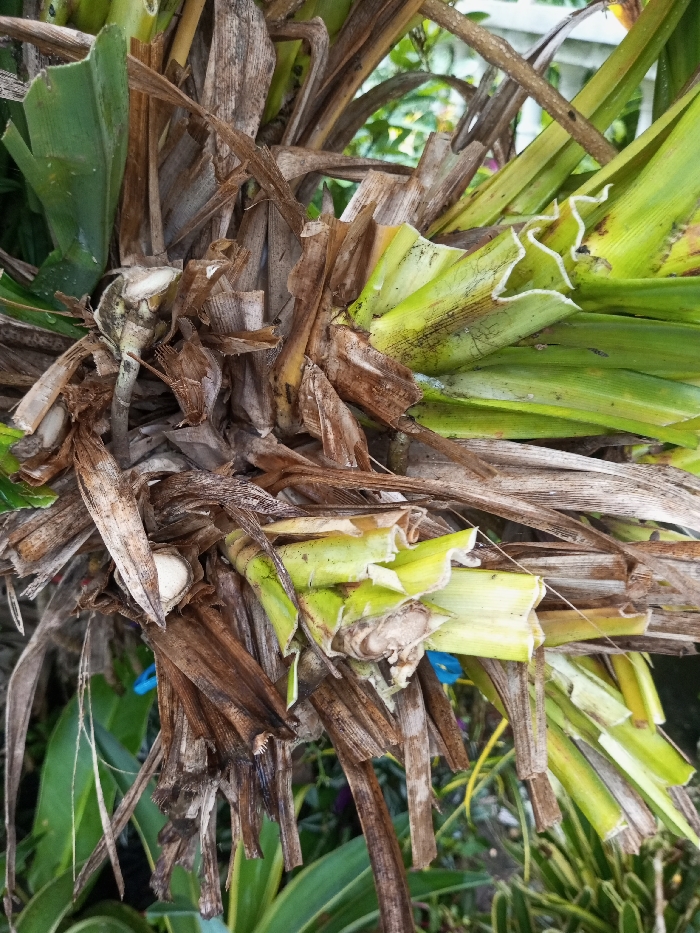 The image displays a close-up, overhead perspective of a dense cluster of plant material situated in Kotakonda, India. The central subject is an aggregation of intertwined plant leaves and fibrous sheaths. A significant portion consists of dried, brown, and decaying leaf sheaths, presenting shades from light tan to dark brown, which are layered and fragmented. Interspersed with these are sections of live, light to medium green leaves, some exhibiting yellowing at the edges, dark streaks, and curled or undulating margins. The cut or broken bases of several leaves, both green and desiccated, expose off-white, fibrous plant tissue. A small, partially obscured blue object, possibly a piece of string or plastic, is visible among the brown foliage. The background is blurred, showing additional green foliage and a white, lattice-like structure, consistent with an outdoor garden environment. No people, active interactions, or distinct actions are present.