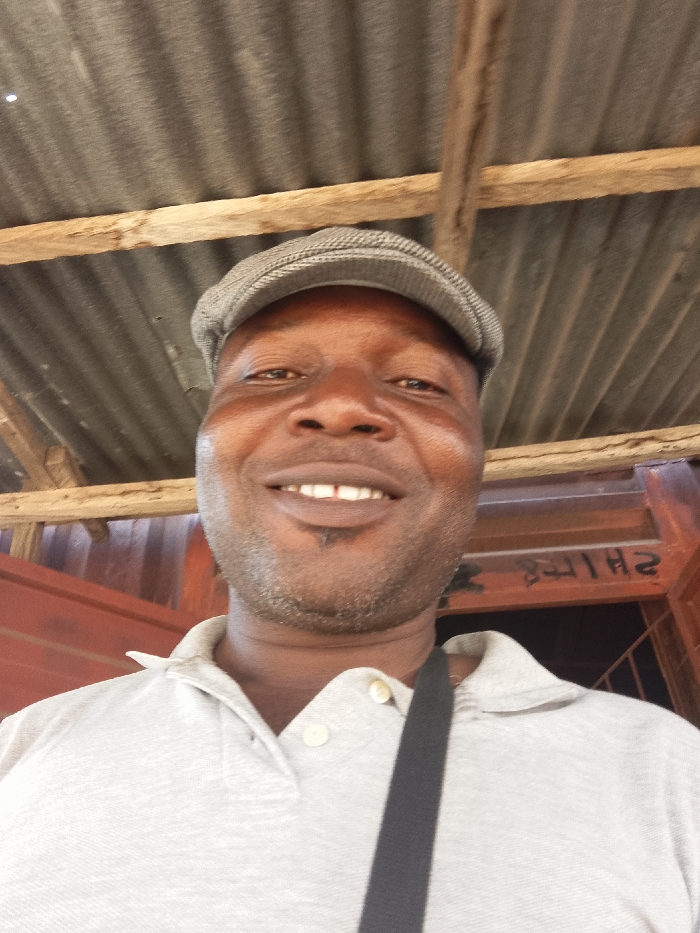 An adult male with dark skin is depicted in a close-up, front-facing image, smiling. He wears a grey newsboy cap and a light grey collared polo shirt with three visible light-colored buttons. A black strap crosses his right shoulder. His facial hair includes a subtle goatee. The background consists of a corrugated metal roof supported by exposed rough wooden beams. To the subject's right, a reddish-brown wooden structure is visible, displaying inverted, light-colored characters. The scene is located in the city of Adankolo, Nigeria.
