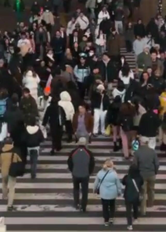 large crowd of people crossing a street at a zebra crossing. The people are wearing a variety of clothing, including jackets, sweaters, and hats. A green traffic light is visible in the upper left corner of the frame. Some people are looking at their phones as they walk. The overall atmosphere suggests a busy urban environment.