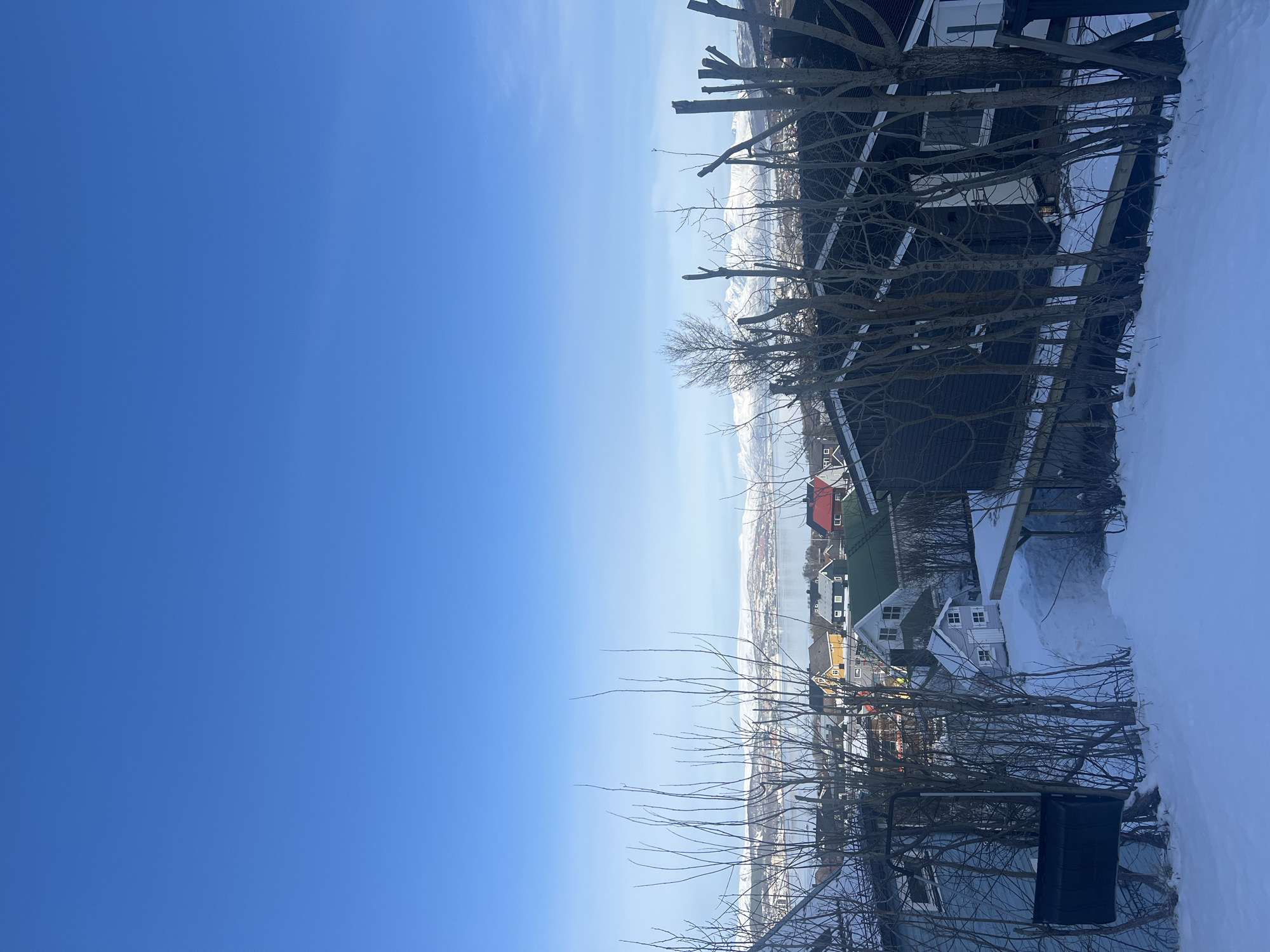 The image displays an elevated winter scene in Tromsø, Norway. The foreground consists of a snow-covered slope populated by numerous bare deciduous trees and bushes, some with trimmed branches. A dark-colored snow shovel is suspended on a pole in the lower-left quadrant. To the right, a dark-paneled house with white window frames and a white door is partially visible, obscured by trees and supported by a wooden structure. The midground features a cluster of residential houses with varied roof colors including red, green, yellow, and dark grey, situated on a hillside overlooking a body of water, identified as a fjord. A small, light-colored house is also nestled among the snow. In the background, snow-capped mountains rise distinctly across the water under a clear, bright blue sky. No individuals are present, and no actions or interactions are depicted.