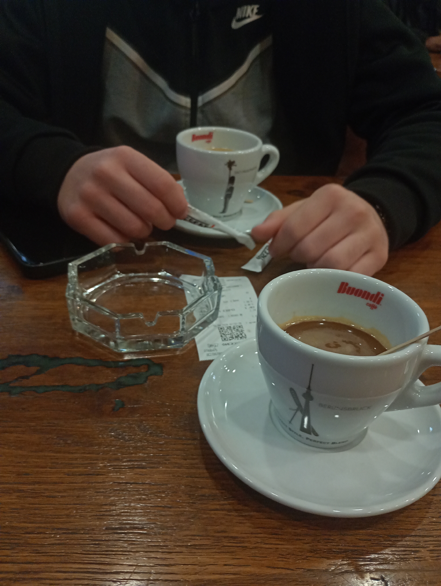 The image depicts a table in a cafe setting. On the table are two cups of Buondi brand coffee with saucers, an ashtray, a receipt, and a smartphone. A person wearing a black Nike sweatshirt is seated at the table, holding a sugar packet. The location is likely Zlataritsa, Bulgaria, given the coffee brand commonly found there. The cafe's interior appears to have wooden table tops.