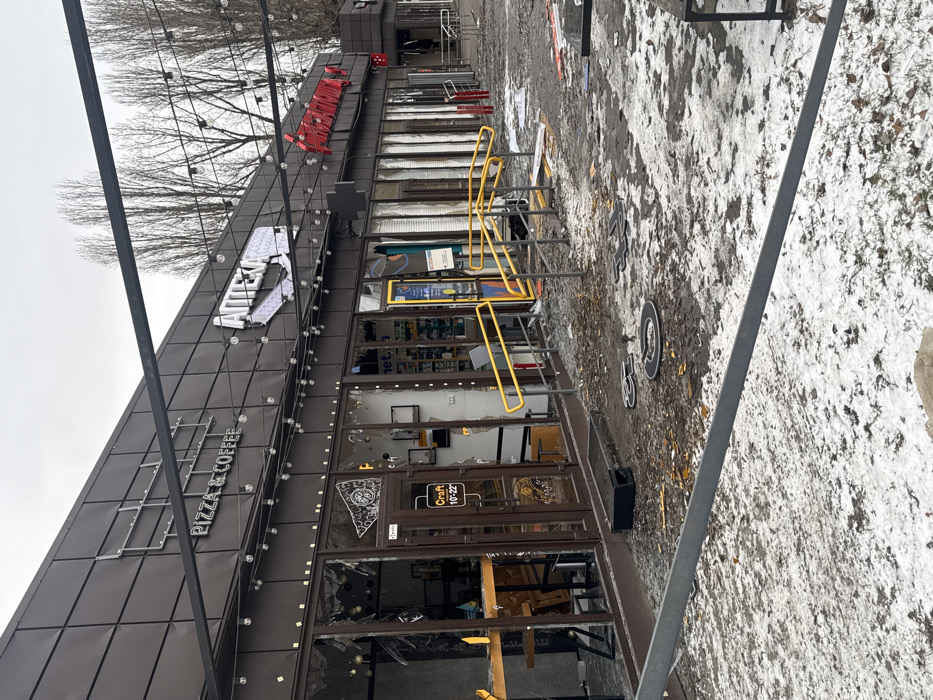This image depicts a damaged row of commercial storefronts in Bila Tserkva, Ukraine, under an overcast sky during winter conditions