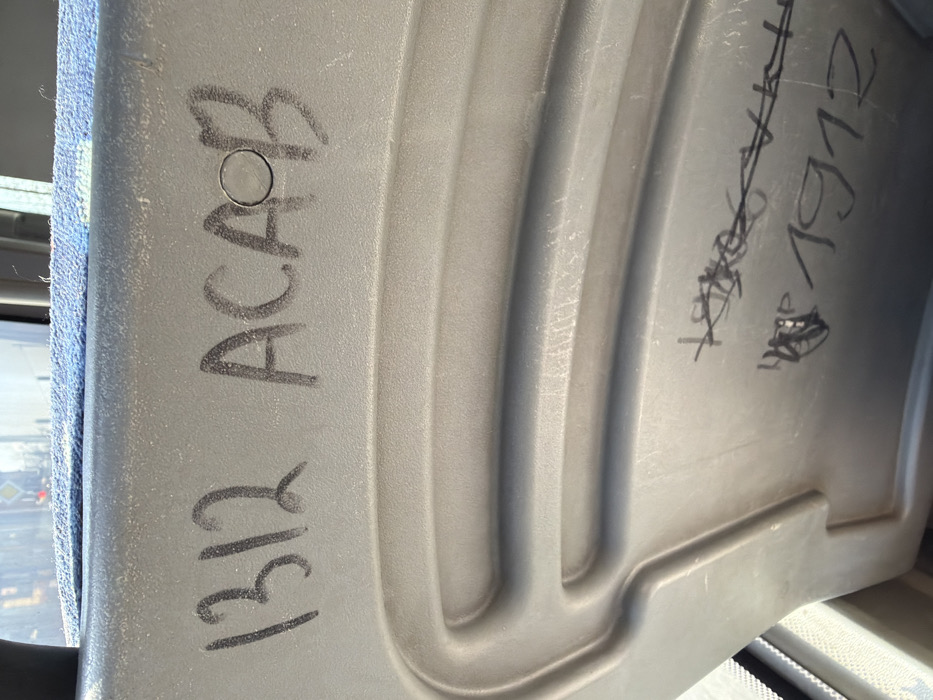 The scene depicts the interior of a public transport vehicle in Plovdiv, Bulgaria. The primary subject is a grey, molded plastic seatback exhibiting minor surface wear and scratches. On the upper section of this seatback, the characters "1312 ACAB" are written in black marker. The 'B' in "ACAB" partially covers a black, circular recessed fixture on the seat. Below this, in the lower right portion of the seatback, the number "1912" is written in black marker, beneath an extensively scratched-out word and a small, illegible symbol. No individuals are visible. Through a window on the left side, a blurred exterior street scene is visible, including a white and red triangular traffic sign, suggesting an urban environment. A strip of blue fabric upholstery is present along the top edge of the plastic seatback.