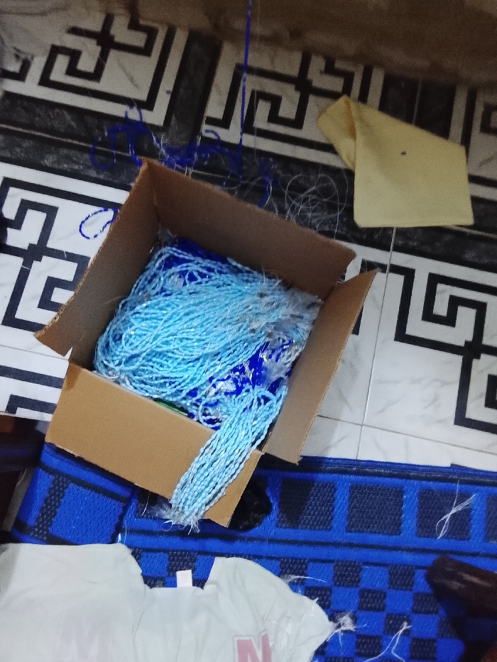 A cardboard box filled with light blue beaded strands sits on a blue checkered surface. Adjacent is a white t-shirt. A yellow square of cloth lies nearby on the patterned tile floor. Scattered blue string and white threads surround the box and objects.