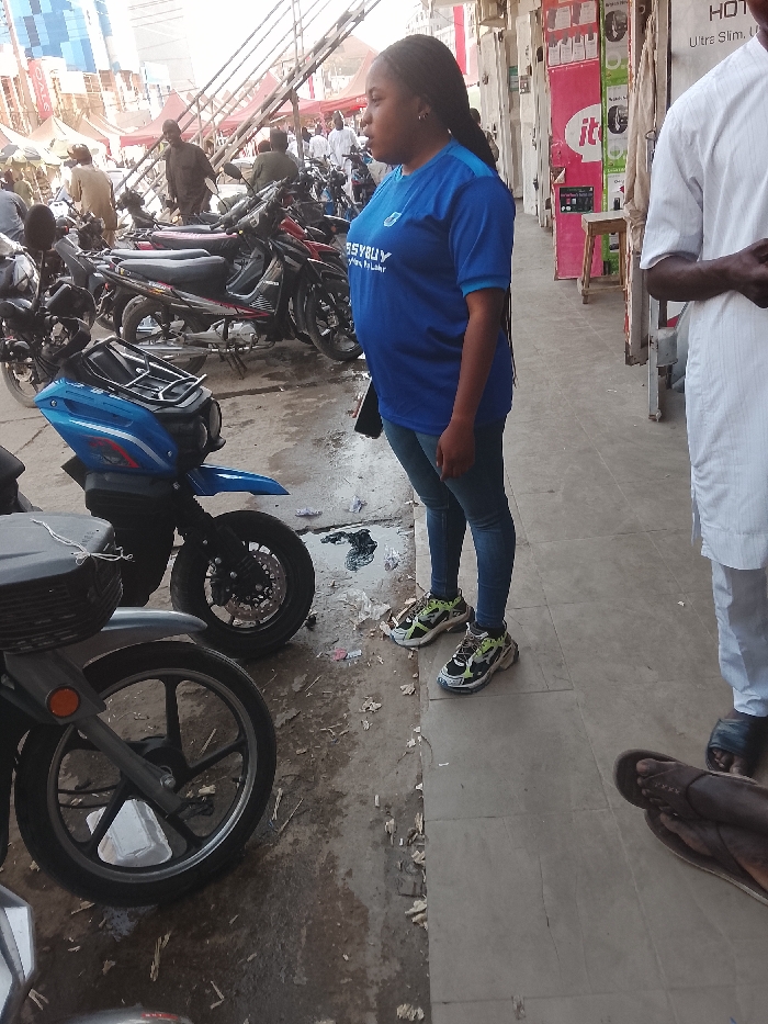 A woman stands on a busy street beside parked motorcycles. She wears a blue t-shirt, jeans, and chunky sneakers. A man in a white robe stands nearby. Several motorcycles line the street behind her, and people walk in the background. Advertisements are visible on a building's exterior wall. The street appears weathered and has scattered debris.
