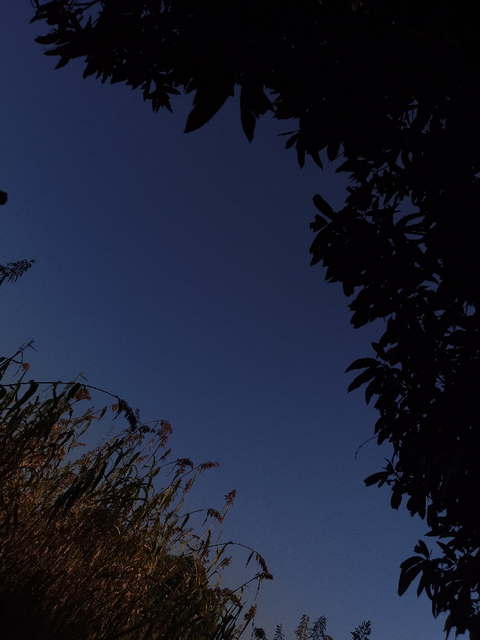 The image displays an outdoor scene at twilight in Narayi, Nigeria. The central area is dominated by a dark blue sky, transitioning from a slightly lighter hue at the lower center to a deeper blue towards the top. Silhouetted vegetation frames the sky. The upper right and top edges feature dense, dark foliage of a broadleaf tree. The lower left and bottom edges show tall, slender plants with distinct seed heads, rendered in dark silhouettes with subtle brown-orange coloration. No persons, animals, or structures are present. No actions or interactions are depicted.