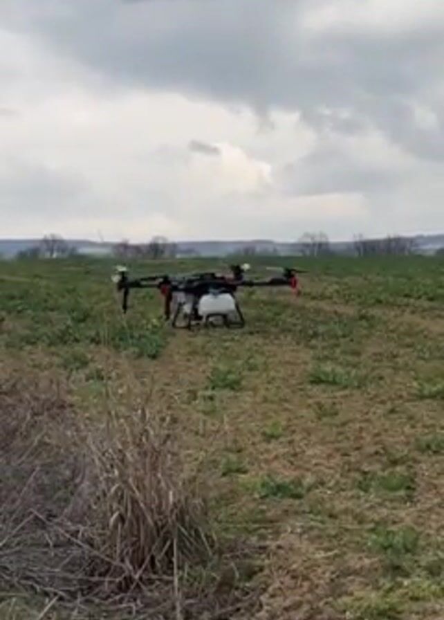 drone lifting off from a grassy field. The drone is black and white with red accents and has a tank attached underneath. The drone takes off slowly and hovers in the air. The background includes a grassy field, trees, and a cloudy sky.